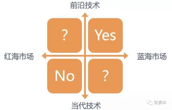 左上角,当红海市场用了前沿技术,就是用了新技术在红海市场做些替代,ToB市场这种情况比较多,特别是To大B。用钛资本内部的说法,就是用开发区的技术挣着老城区的钱;