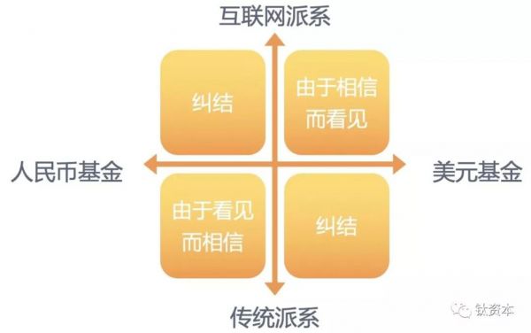 但这两块也在融合,因为市场本身在融合,所以又出现了两个比较纠结的象限,这里的偏差或争执最多:一个是互联网派系的投资人到人民币基金,这时拿人民币投资就非常纠结了。因为做大B太慢了,哪像互联网那么快,技术是领先但过两年才能有产品出来,还要一个个地去磕客户,但基金的存续期只有7年。