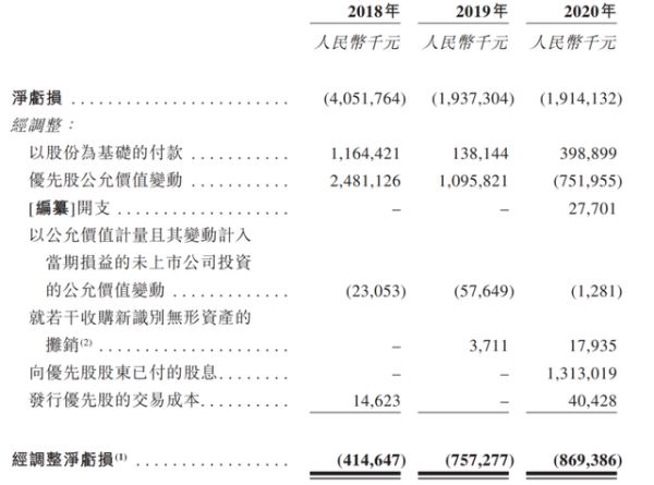 当然,2020年的亏损调整中还有优先股公允价值的变动这一块是负值,这意味着有一部分优先股股东是转移成了当前的普通股,中间是存在着优先股股价到普通股股价下跌的。