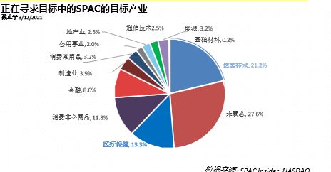 目前信息技术差很大的产业超过了21%,医疗保健超过了13%,其他类别的消费类占到10%,更多的其他类都是在10%以下。这些SPAC公司在寻求产业方向公司的合并过程当中,揭示了市场上资本它更偏好哪些风口上行业的企业。