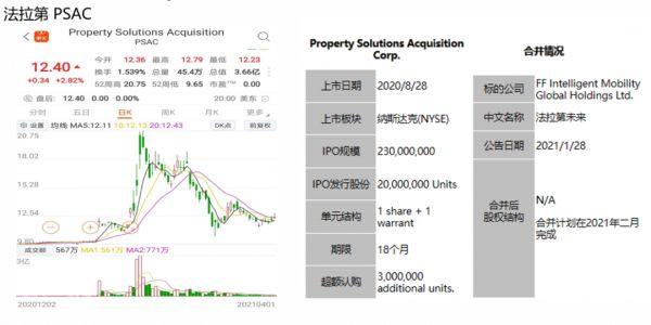从上图可以看到美国FF汽车宣布跟PSAC这家公司并购之后,SPAC这家公司股票直接就跳到12块多钱,两周之内翻了一倍,达到21块钱附近。最近的股价依然是在12、3块钱附近波动。记住一点,这家公司依然现在SEC的审核阶段,还没有实现最后的合并。从资产端的角度和市场的投资者来讲,都是皆大欢喜的事。