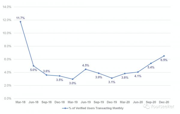 上文提过,Coinbase 目前服务 4300 万散户。2018 年初,每月交易用户占总数的 12%;但截至 2020 年底,只有 6.5% 用户在当月完成交易,即 280 万。