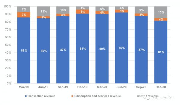 下图是招股书中披露的按类型划分的单个季度收入来源。Coinbase 收入有三:交易费用(蓝色)、订阅服务(橙色)和其他(灰色)。交易费用长期以来占总营收 80% 以上。