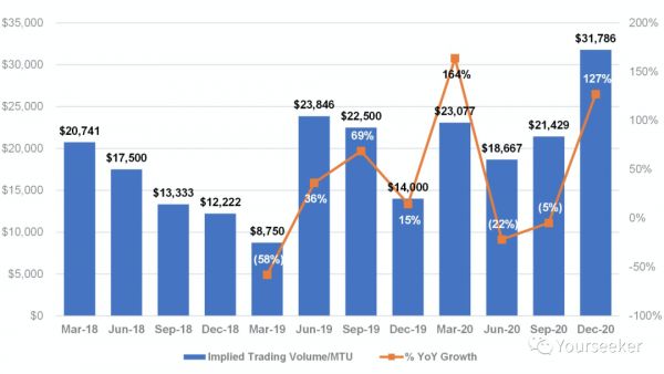 虽然交易频次变少了,但散户们的交易规模逐年上涨。截至 2020 年底,每 MTU(monthly transacting users)交易量接近 32000 美元。折算下来,每个散户单季度贡献 450 美元(32000*1.42%)。