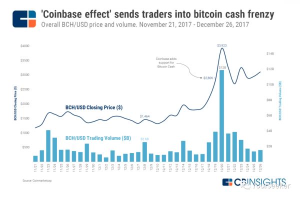 一个例子是 BCH。美东时间 2017 年 12 月 19 日晚上 7 点,Coinbase 列出了平台第四项加密资产:BCH。随后全球各大交易所该币种的交易量猛增。