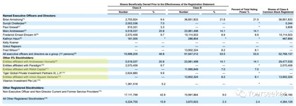 VC 方面,至今持股 5% 以上的外部股东包括 A16Z(15.8%),昔日联合创始人&后来加密基金 Paradigm 创始人 Fred Ehrsam(9.5%),USV(7.5%)和 Ribbit Capital(6.4%)。