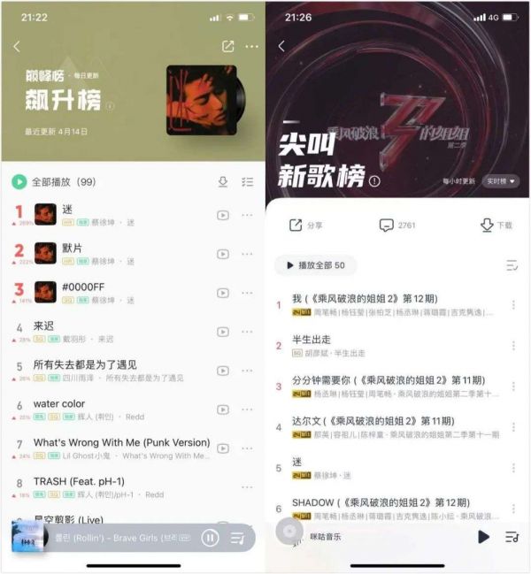 具体来看,以几家平台呈现新歌表现的榜单为例,4月14日,咪咕音乐“尖叫新歌榜”TOP50中除了蔡徐坤新专辑两首歌外,其余均为免费可听歌曲,且其中有17首为目前热播综艺、影视剧相关歌曲;QQ音乐“飙升榜”TOP50中,有6首歌为VIP限定8首歌为限时免费可听,上榜歌曲大部分是歌手eP、专辑新作;而像是用户盘最大的酷狗音乐“飙升榜”TOP50中,虽然均为免费可听,但只有9首歌曲为华语流行知名歌手及综艺相关歌曲,其他更多为网络流行翻唱、短视频流行歌曲。