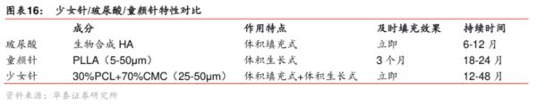 回到爱美客和华东医药在这一赛道的角力来看。华东医药的“少女针”,又可以被看做是“二代童颜针”,在某些方面优势明显:其成分中的CMC可以注射后立刻起到填充效果,而童颜针需要一定时间起效;另外,其可维持时间较童颜针更长;另外,该“少女针”已于2009年欧洲上市,应用历史长且表现出良好的安全性,可避免在安全问题重蹈爱贝芙的覆辙。