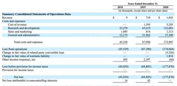 招股书显示,2018年至2020年三年间,图森未来的营收分别是:9000美元、71万美元、184.3万美元。与之对应的是,这三年间其净亏损分别为:4503万美元、8488.3万美元、1.77亿美元。尽管图森的营收在不断增长,但却并未形成规模,同时亏损也逐年扩大。