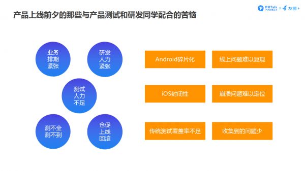 第二部分是产品测试。现在的测试碎片化很严重,如果产品崩溃,很难确定是哪里出了问题。另外在产品测试上,人力紧张一直是个问题。比如今天布置的任务,给出的测试期限是1天半,那么如何减少成本,提高测试的深度和广度,并能免去昂贵的产品维护费,是很多产品经理需要解决的问题。
