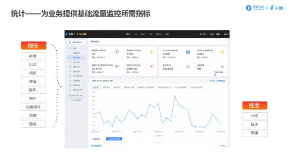 关于统计,产品经理会关注很多指标,例如新增指标、启动指标,以及活跃、渠道、版本、留存,或者设备型号等指标,这些都能拿来用,然后可以生成专属的用户行为标签,催生出自己的目标。还有一个是维护,产品经理可以从时间、产品、渠道进行归纳,并进行相关分析。