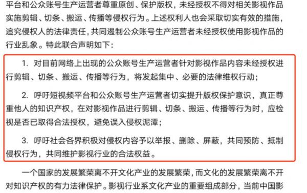 在法律人士看来,此次联合声明只能算是影视行业单方面发声,并不具备具体的可执行力。事实上,此次和2018年谷阿莫事件后广电发布的包含“坚决禁止非法抓取、剪拼改编视听节目的行为”条款的部门文件性质差不多。