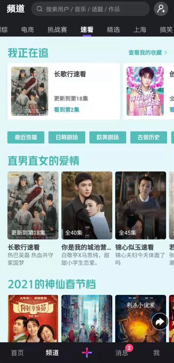 观察随刻和微视可以发现,不仅设置了剧集和综艺等长视频观看的入口,还增加了速看功能——将剧集单集内容剪成几分钟的短视频做成合集,也有热播剧综的物料合集专区,类似抖音的话题合集。