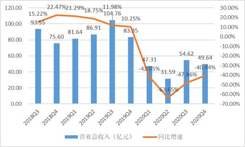 2020年四季度,携程实现营业收入49.64亿元,环比降低4.98亿元,这主要受四季度淡季影响。旅游业具有明显的周期性,三季度包含“五一”和“十一”等旅游节日,属于“业绩旺季”,其他季度属于“业绩淡季”。因此,携程2020年三季度的营收规模达到54.62亿元,处于“业绩波峰”。
