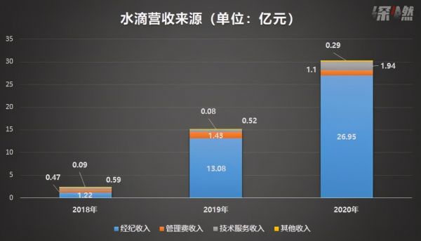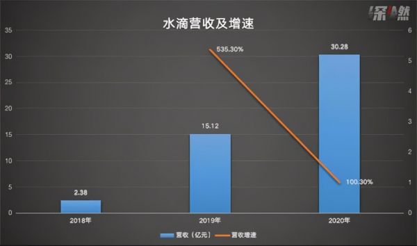 2018年到2020年,水滴公司营收分别为2.38亿元、15.12亿元、30.28亿元,其2019年营收同比增速达到了535.3%,2020年增速有所下降,仍然达到了100.30%。