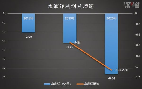 营收和增速颇为亮眼,但代价是数额不小的亏损。从2018年至2020年,水滴公司一直处于亏损状态,净亏损分别为2.09亿元、3.22亿元及6.64亿元。从2019年到2020年,水滴营收翻了一倍,亏损也翻了一倍。