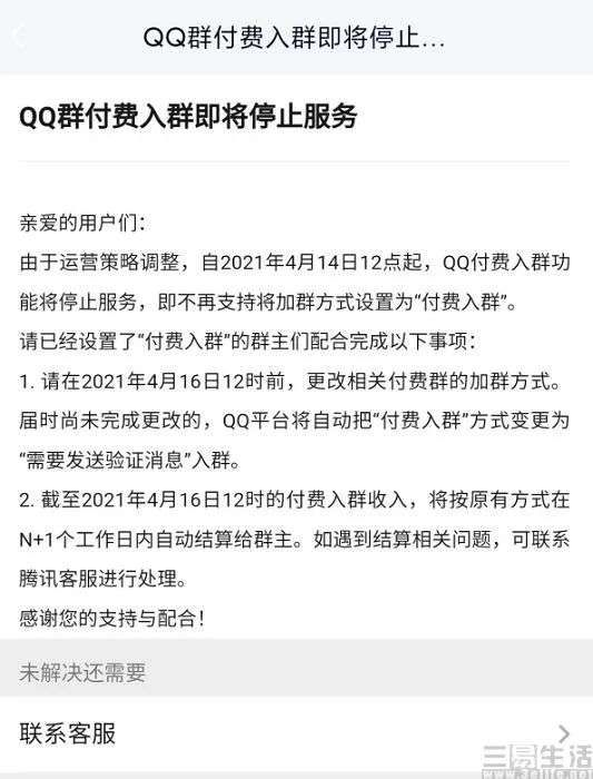近日腾讯方面发布公告称,自2021年4月14日12点起QQ付费入群功能将停止服务。其中显示,在2021年4月16日12时前,已设置“付费入群"的群主需更改相关付费群的加群方式,届时尚未完成更改的QQ将自动把“付费入群"方式变更为“需要发送验证消息"入群,截至2021年4月16日12时的付费入群收入,则将按原有方式在N+1个工作日内自动结算给群主。因此在外界看来,QQ付费入群功能的下线,也正式宣告了QQ群变现或已成为一条走不通的道路。