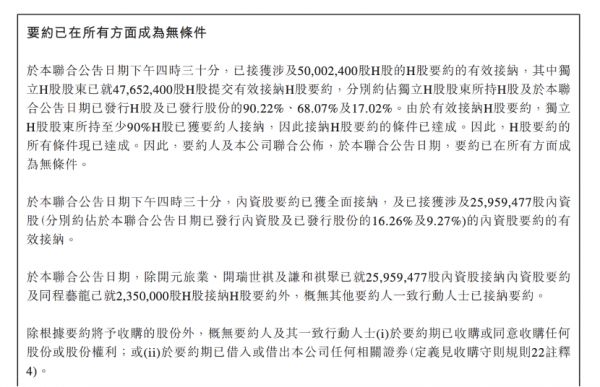 根据公告,浙江开元酒店的H股要约已在各方面达成无条件,包括超过了独立H股股东所持至少90%的H股要约的最低有效接纳要求。