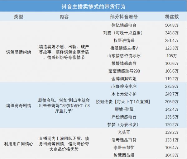 3月份,抖音安全中心发布《“卖惨带货、演戏炒作”违规行为处罚公示》。公告称,平台已对卖惨带货、编造离奇故事、演戏炒作等行为进行违规处罚。近30天内,处理相关违规直播间446个,封禁违规账号33个,“光头哥”“徐忆情感电台”“权哥讲情感”“聊城-孙超”等12个百万粉丝主播一夜被封。