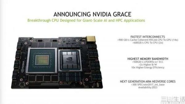 一方面,英伟达此次高调公布了名为“Grace”的新型计算方案,其使用了一颗基于ARM下代Neoverse架构的CPU。但实际上CPU本身并不是重点,重点在于英伟达为这颗定位于服务器、超级计算机的CPU,加上了原本为低功耗移动设备设计的LPDDR5x内存,同时还使用自研的NVLINK4接口,取代了传统PC平台上用于安装GPU的PCIE插槽。
