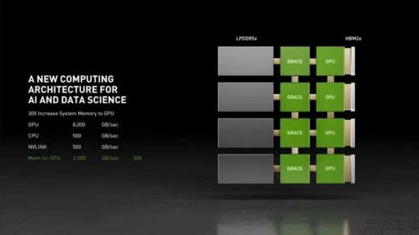 根据英伟达方面的说法,使用LPDDR5X内存而非传统超算上DDR4(或者最新的DDR5)内存的理由,在于低功耗内存可以大幅节约能源,为本就高能耗的服务器CPU提高能效比。而NVLINK接口与PCIE相比,可以将GPU与CPU之间,以及GPU和系统内存之间的通信带宽都增大三十余倍,从而实现内存和显存的“统一融合”,大幅加强整套系统在计算时的灵活度。
