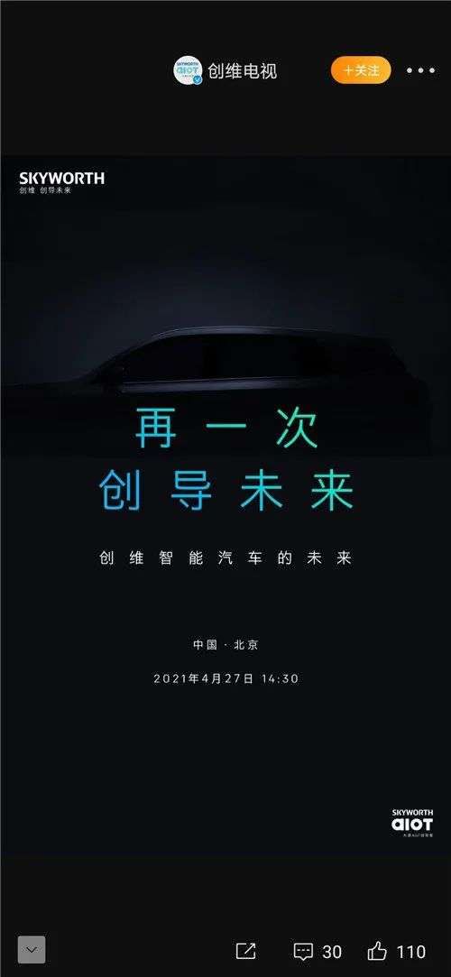 4月13日,创维电视官方在微博上宣布,将于4月27日举行主题为“创维智能汽车的未来”的沟通会。因此,创维要造车的消息呼之欲出。相较于当年的格力造车而言,创维造车的消息并没有在汽车领域掀起千层浪。这当然不是因为它的咖位不够,而是大家已经对跨界造车的消息产生了麻木的感觉。