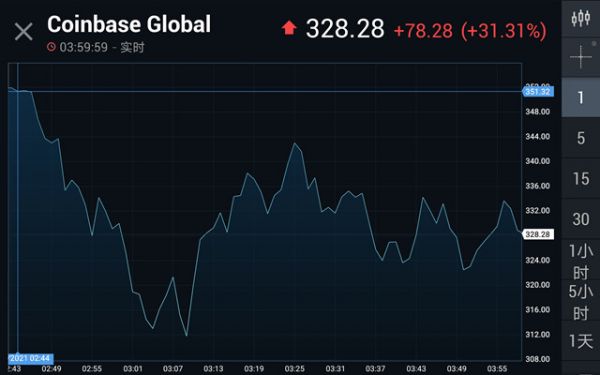 本周四,也就是Coinbase上市的第二天,该股开盘一度上冲6.4%,但随后震荡下跌,全天报收于322.75美元,较前一交易日下跌1.68%。