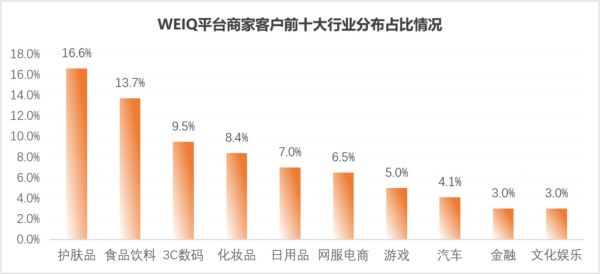 一方面,市场的需求缺口更大了。根据财报,天下秀WEIQ平台上接入的商家数量稳步增加,2020年全年在平台内进行充值或者下单的活跃商家客户数达到8,342个,同比增幅达31.70%。并且从行业分布上来看,除了护肤、食品饮料、3C数码等一直以来都有着较强营销需求的商业,汽车、金融等传统行业也开始试水红人营销。