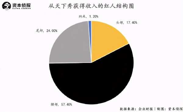 其中,腰部红人是占比最大的群体。根据财报,通过天下秀平台获得收入的红人中,腰部红人占比过半,达到57.4%,此外尾部红人占比24.0%,头部红人占比17.4%,纳米红人占比1.2%。这一收入结构反映出红人新经济中的一个基本投放逻辑:用头部红人制造话题,用真实感、性价比更高的腰部红人创造测评、笔记等体验内容,用尾部及纳米完成种草、扩大传播。