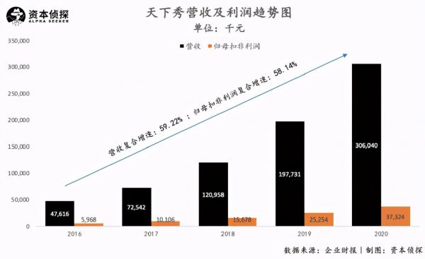 2020年,天下秀实现营业收入人民币30.60亿元,同比增长54.78%;实现归属于上市公司股东的扣非净利润人民币3.73亿元,同比增长47.80%。近五年,天下秀营收的年复合增长率达到59.22%,扣非净利润的复合增长率达到58.14%;新经济的时代电梯中,赚到钱的可远不只是红人。