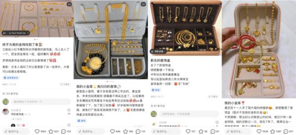 而社交媒体上,也不断有人晒出自己的金饰存货,从小金牌、小金坠到沉甸甸的金镯子、金链子,黄金饰品在年轻一代的首饰柜中,似乎越加拥有一席之地。