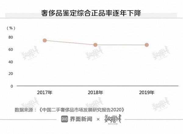 奢侈品流通中到底有多少假货?客观数据或许可以告诉我们答案。据悉,在2016年海外代购的奢侈品中约60%是假货,《中国二手奢侈品市场发展研究报告2020》显示,在2017年,优奢易拍鉴定的所有商品中仅有3成多为正品,且正品率在逐年下降,到2019年,综合正品率为33.6%,相比三年前下降4个百分点。