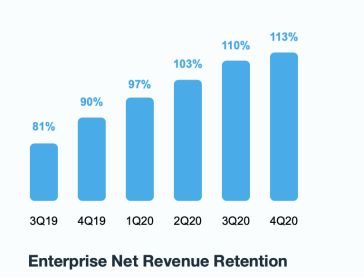 截止2020年12月31日,企业用户的收入留存率(NRR)增长至 113%,实现了连续7个季度的持续上升。这意味一年前Vimeo所拥有的企业用户增加了订购或者升级了服务,使之在当前支付的费用比去年同期更多,且这样的喜人现象有持续延续之势。