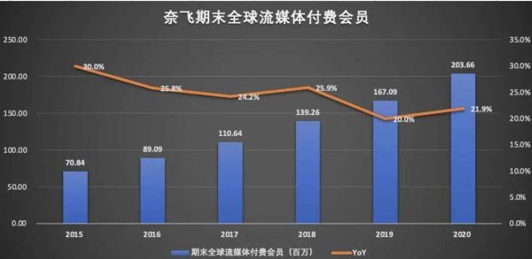2020年爆发的全球性公共卫生事件,缓解了奈飞新增付费用户放缓的颓势,在疫情的“催化”下,奈飞全球流媒体新增付费用户同比增长31%。