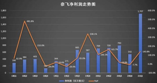 财报数据显示,2021年一季度,奈飞的净利润为17.07亿美元,较上年同期7.09亿美元,增长140.8%,较较上一季度的5.42亿美元,增长214.9%。