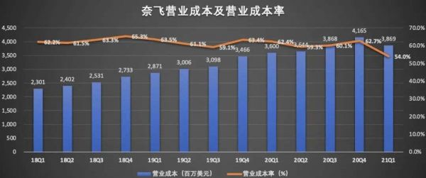 财务数据显示,2021年一季度,奈飞的营业成本为38.69亿美元,较上年同期的36亿美元,仅增长7.5%,较上一季度的41.65亿美元,减少了7.1%。一季度奈飞的营业成本率为54%,较上一季度的62.7%大幅下滑。