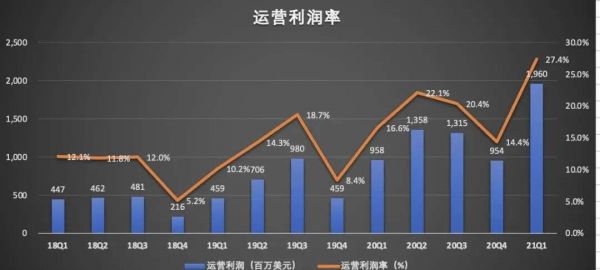 营业成本的下降,带动了运营利润的增长。财报数据显示,2021年一季度,奈飞的运营利润为19.60亿美元,较上年同期的9.58亿美元,增长105%,较上一季度的9.54亿美元,增长105%,运营利润率从上一季度的14.4%上升至本季度的27.4%。