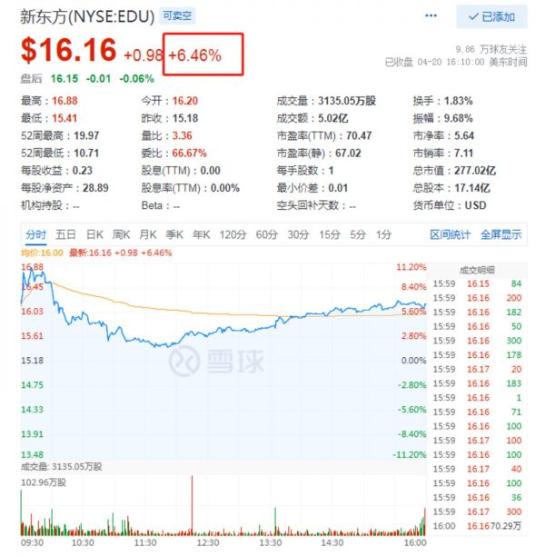 在财报发布后,新东方盘前上涨一度超3%。最终收盘涨6.46%。