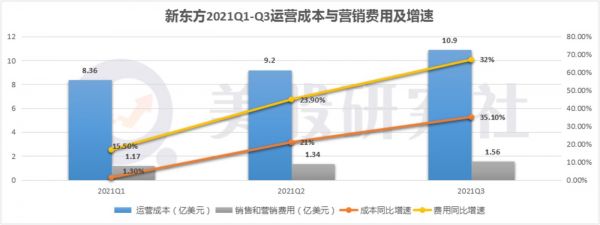据公告显示,该季度的运营成本和支出为 10.9亿美元,同比增长35.1%。销售及市场推广费用达到了1.56亿美元,同比增长了32.0%。背后原因是为了业务扩张,新东方增加了销售人员,推行OMO在线课程。