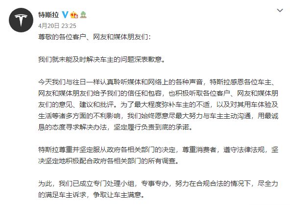 4月20日深夜,特斯拉发布一纸声明,一改强硬姿态,向上海车展维权事件的女车主致歉。