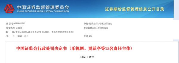 2021年4月,中国证监会公布对乐视网、贾跃亭等15名责任主体的行政处罚决定书。