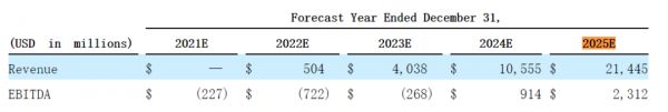 FF在上市文件中展现了美好规划:2022年,开始交付第一批FF91,当年销量2400辆,2024年三款车销量11.3万辆,到2025年,四款车型共销售30.2万辆。销量迅速增加,拉动营收大幅上涨,FF预期2022年营收为5.04亿美元,2025年跃至214.45亿美元,增幅约41.5倍。这也是FF说服特殊目的收购公司PSAC合作的一项重要原因。