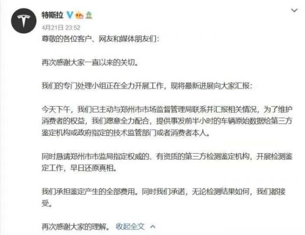 21日深夜,特斯拉官方微博再次发布声明称,已主动与郑州市市场监督管理局联系并汇报相关情况,愿意全力配合,提供事发前半小时的车辆原始数据,并承担鉴定产生的全部费用,且无论检测结果如何都会接受。