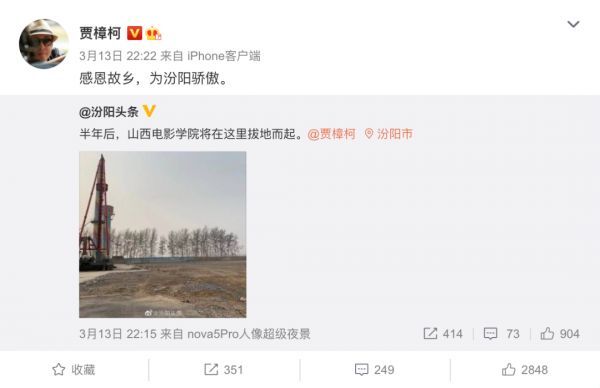 ▲今年3月13日,贾导曾在微博上发布消息,称为故乡感到骄傲