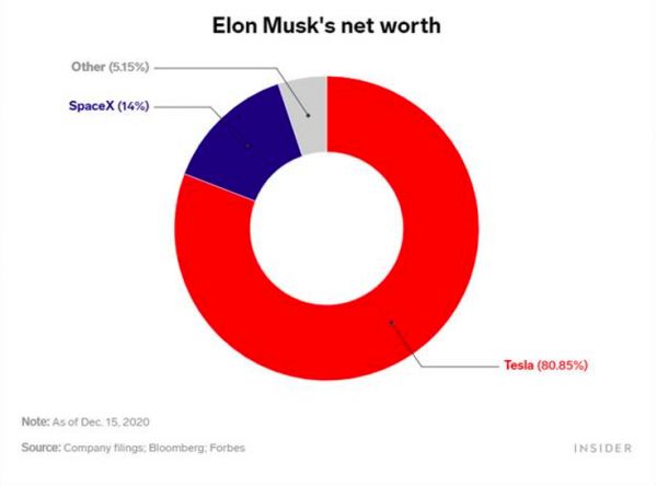 马斯克作为特斯拉的CEO是这艘新能源大船的舵手,一度跻身世界首富的马斯克的资产构成却很有趣,2020年5月马斯克表示他计划出售“几乎所有”个人财产,当下马斯克资产主要分布在特斯拉和Space X的股权,两家公司的股权分别占总资产的80.85%和14%,其他资产仅为5.15%。