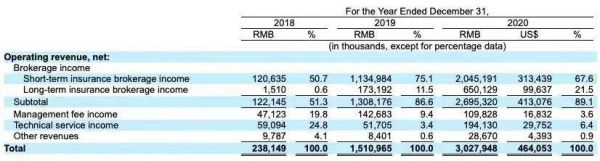 在其收入构成中,保险业务的佣金收入占了绝对大头。2020年,该收入为26.95亿元,占比89.1%,技术服务收入1.94亿元,占比6.4%,管理费收入1.10亿元,占比3.4%,其他收入2867万元,占比0.9%。