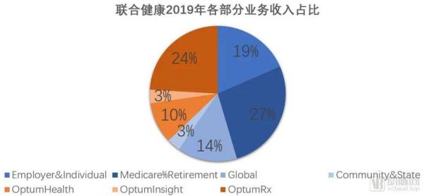 联合健康业务目前分为两大块,一块是健康保险业务体系(类比水滴保)的收入,一块是健康服务体系(类比水滴刚刚孵化的”好药付“,大病研究中心等)。尽管目前,前者依然贡献了其营收和利润的大头,但后发的健康服务业务,营收和利润占比,以及营收增速均高于前者,2019年,健康服务体系的营收贡献占比已经高达37%,同比增长11.5%,高于保险板块的5.6%。