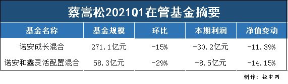 根据季报,2021年一季度诺安成长亏损30.2亿元,净值减少11.39%;诺安和鑫亏损8.5亿元,净值减少14.15%。蔡嵩松管理的两只基金期末总规模329.4亿元,相比2020年底的403亿元缩水18%。