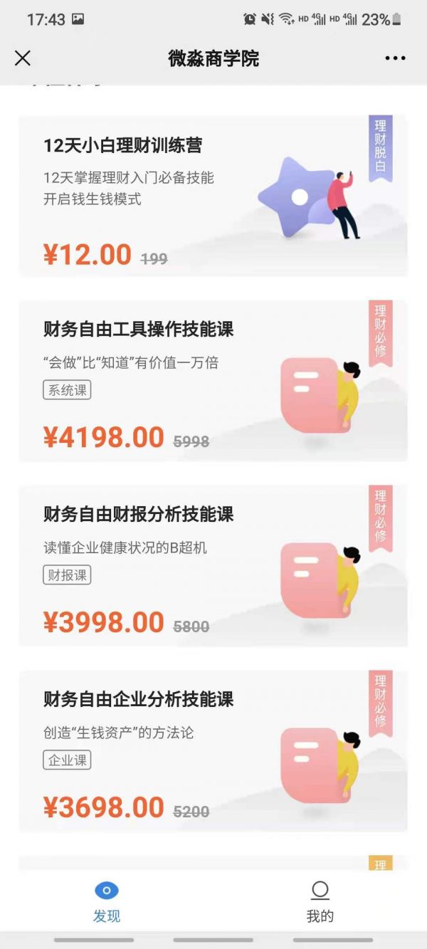 微淼商学院则显得更为纯粹,其课程完全为了财务自由而设计,主要就是为了帮助小白普及理财知识、掌握理财方法,平台还专门标明不卖保险和理财产品。