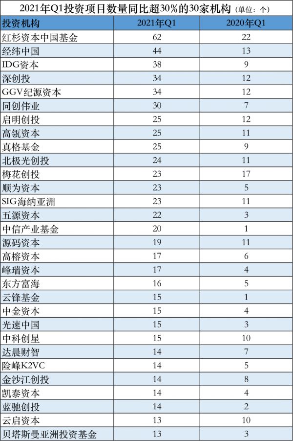 第一新声根据it桔子统计,从投资数量或投资额来看,2021年Q1国内最活跃机构Top30的投资节奏加快,25家投资数量涨幅同比超100%。其中,红杉资本中国基金、经纬中国、idg资本分别投资了62、44、38个项目,同比增加了40、31、29个。
